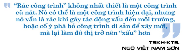 – “Rác công trình” không nhất thiết là một công trình cũ nát. Nó có thể là một công trình hiện đại, nhưng nó vẫn là rác khi gây tác động xấu đến môi trường, hoặc cố ý phá bỏ công trình di sản để xây mới, mà lại làm đô thị trở nên “xấu” hơn! Không chỉ tại TP.HCM, mà cả nước, đang mọc lên không ít “rác công trình” như vậy, gây thiệt hại lớn cho đất nước.