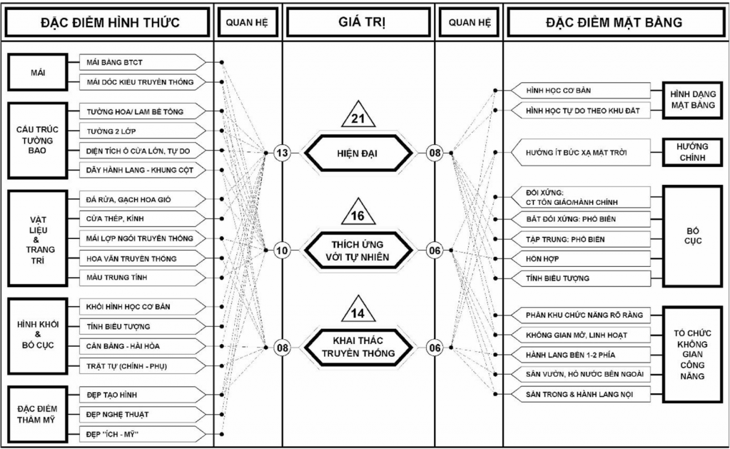 Sơ đồ [Hình 15] phân tích mối quan hệ giữa các đặc điểm hình thức và công năng của kiến trúc miền Nam Việt Nam giai đoạn 1954 – 1975 với 03 giá trị tiêu biểu. Thông qua việc xác định số lượng kết nối của từng giá trị với các đặc điểm kiến trúc, có thể thấy thứ bậc quan trọng của các giá trị này, cũng như vai trò của chúng trong việc định hình phong cách kiến trúc miền Nam.