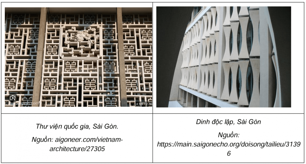 – Lam chắn nắng (Brise-soleil): là yếu tố phổ biến trong kiến trúc hiện đại miền Nam nhằm giảm thiểu tác động của ánh nắng trực tiếp vào không gian nội thất; tạo nên hiệu ứng ánh sáng độc đáo khi nắng xuyên qua. Các lam chắn nắng thường tạo hình hoa văn cách điệu nhằm tăng tính thẩm mỹ cho công trình. [Hình 10]