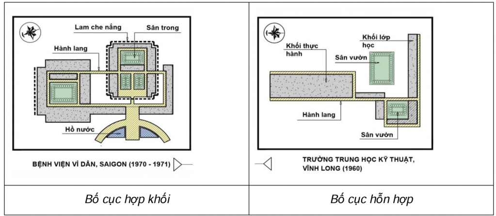 – Bố cục phổ biến là dạng hợp khối (gồm các kiểu: tập trung, hướng tâm, phân nhóm hoặc theo tuyến) hoặc bố cục hỗn hợp (kết hợp giữa phân tán và hợp khối). Các hình thức bố cục này khá thuận lợi để sắp đặt công năng theo dây chuyền hiện đại. Ngoài công trình tôn giáo và hành chính thường có bố cục hợp khối – đối xứng thì các thể loại còn lại linh hoạt giữa hình thức đối xứng và bất đối xứng tùy theo nhu cầu và ý tưởng thiết kế. [Hình 4].