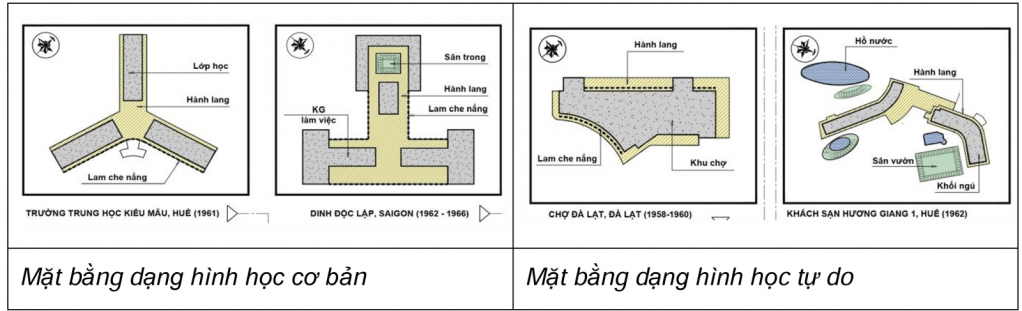 Tổng hợp dữ liệu điển hình về mặt bằng [Hình 1] và hình thức kiến trúc [Hình 2] có thể nhận diện đặc điểm chung và riêng của các xu hướng kiến trúc hiện đại miền Nam như sau: