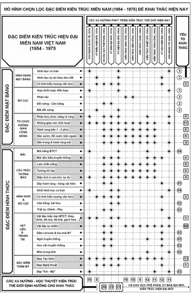 Để xác định yếu tố quan trọng cho việc khai thác và phát huy trong kiến trúc Việt Nam hiện nay, bài nghiên cứu thiết lập mô hình tương tác giữa các đặc điểm kiến trúc hiện đại miền Nam, trên cả 02 phương diện công năng và hình thức, với 12 xu hướng kiến trúc thế giới đang thịnh hành. Nguyên tắc thực hiện là đánh số tương tác giữa đặc điểm kiến trúc miền Nam với quan điểm lý thuyết và thực hành của các xu hướng kiến trúc thế giới, được ghi nhận từ trong chính các xu hướng đó hoặc suy luận tương đồng. Những đặc điểm nào có trị số ≥ 5 sẽ được chọn; và đặc điểm có trị số càng cao thì càng được ưu tiên. Ngoài ra, các xu hướng kiến trúc có nhiều tương tác với đặc điểm kiến trúc miền Nam cũng sẽ được chọn để làm nền tảng lý thuyết định hướng cho quá trình khai thác.