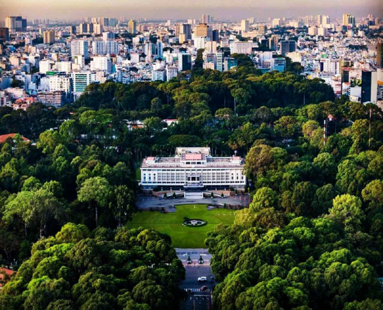 Không gian trung tâm lịch sử Dinh Độc Lập với hậu cảnh những nhà cao tầng xây dựng sau 1975