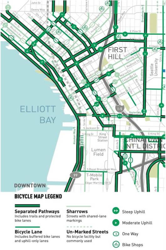 Bản đồ chi tiết quy hoạch Hệ thống Đường riêng cho Xe đạp của Tp Seattle (Mỹ), là giải pháp cộng thêm, cùng với quy định cho phép chạy xe đạp trên đa số vỉa hè, trừ một vài khu vực đặc biệt có biển báo, miễn là xe đạp phải tuân thủ quy tắc luôn nhường đường cho người đi bộ